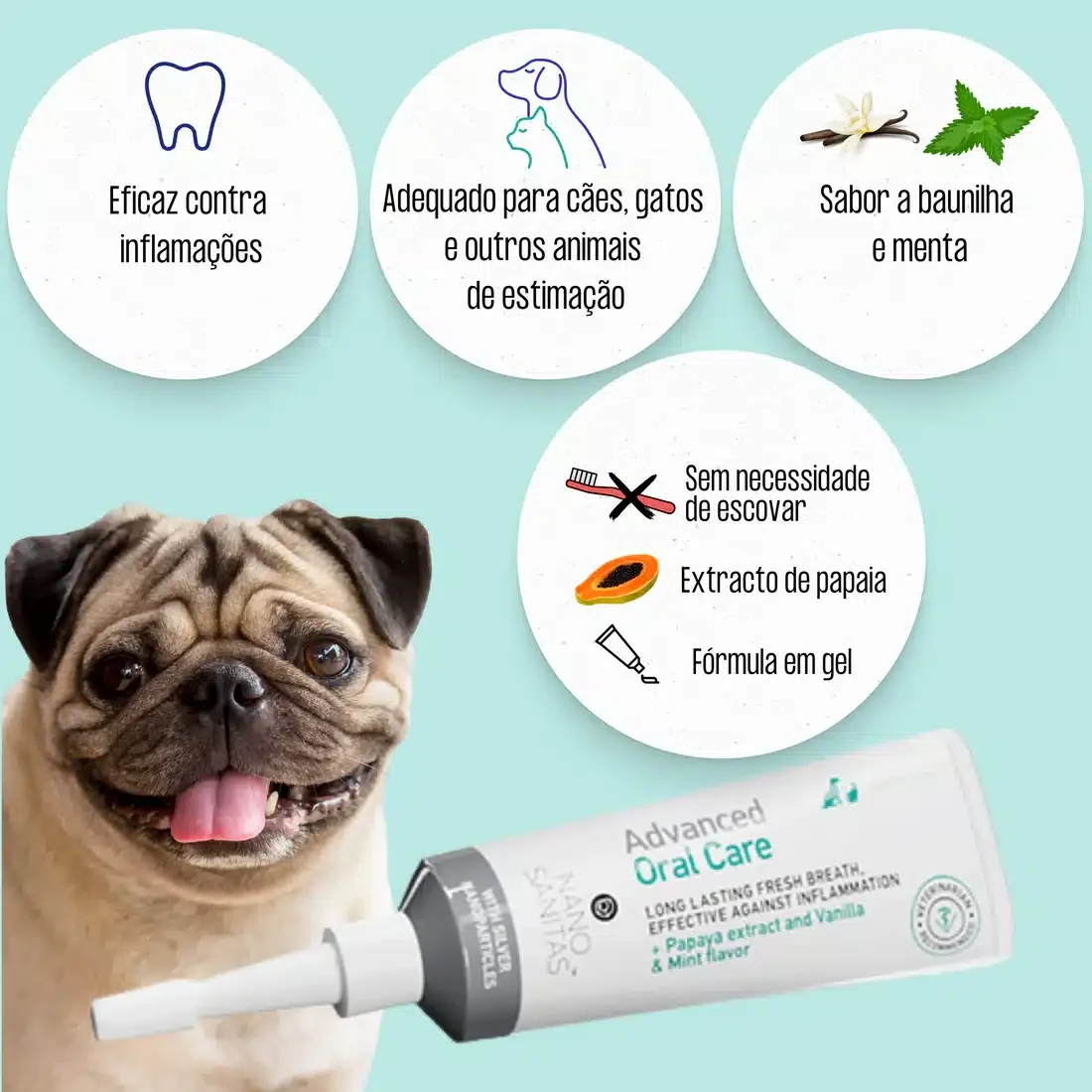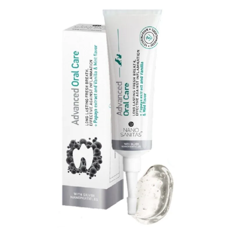 Este gel é uma mistura única de nanopartículas meticulosamente projetadas e dos ingredientes mais puros da natureza. Baseia-se numa fórmula mucoadesiva (ou seja, aderente às gengivas), que garante que os princípios ativos (nanopartículas de prata e extrato de papaia) permanecem em contacto com os dentes e gengivas dos animais de estimação, durante um longo período de tempo.