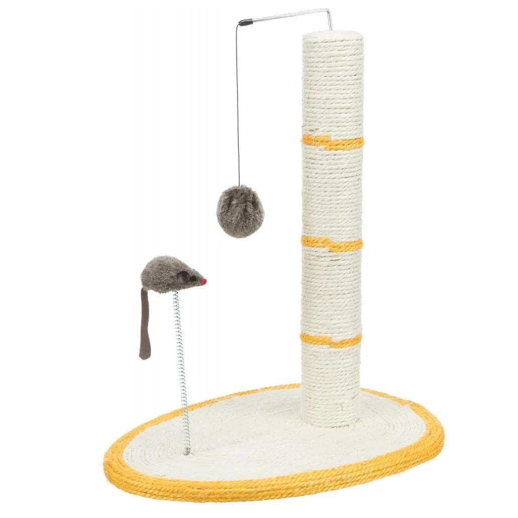 - Completamente envolvido em sisal natural - Com brinquedo suspenso em corda e suporte giratório - Com brinquedo em mola - Com catnip - Cores sortidas - Dimensões 40 x 30 x 50cm