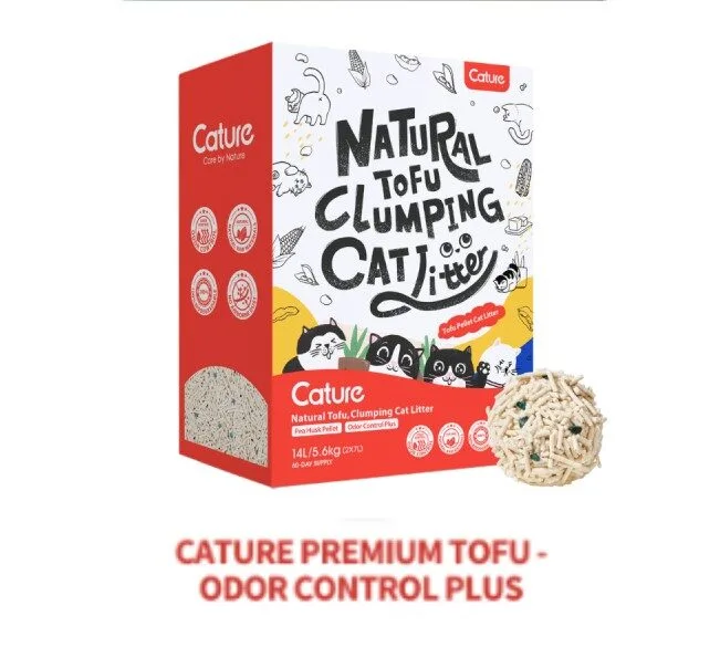 Cature® Premium Cat Litter Tofu, é um absorvente para higiene de gatos, inteiramente de origem vegetal à base de ervilha, 100% natural, biodegradável e isento de componentes químicos e seguro, mesmo se acidentalmente ingerido. As fibras vegetais de tofu retêm os líquidos criando uma bola compacta, facilmente removível e eliminável na sanita ou no lixo doméstico. Tem um poder de absorção muito grande e retém os maus odores. O tofu é leve e suave nas patas, 100% seguro e não tóxico para humanos ou animais, não risca o chão nem solta poeiras.