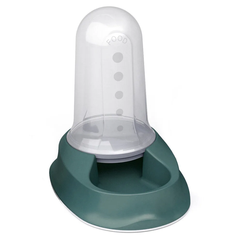 Comedouro/bebedouro para cães e gatos, com dispensador. Pode encher com água ou ração seca, que vai descendo para a taça consoante o patudo come ou bebe. Base antiderrapante.