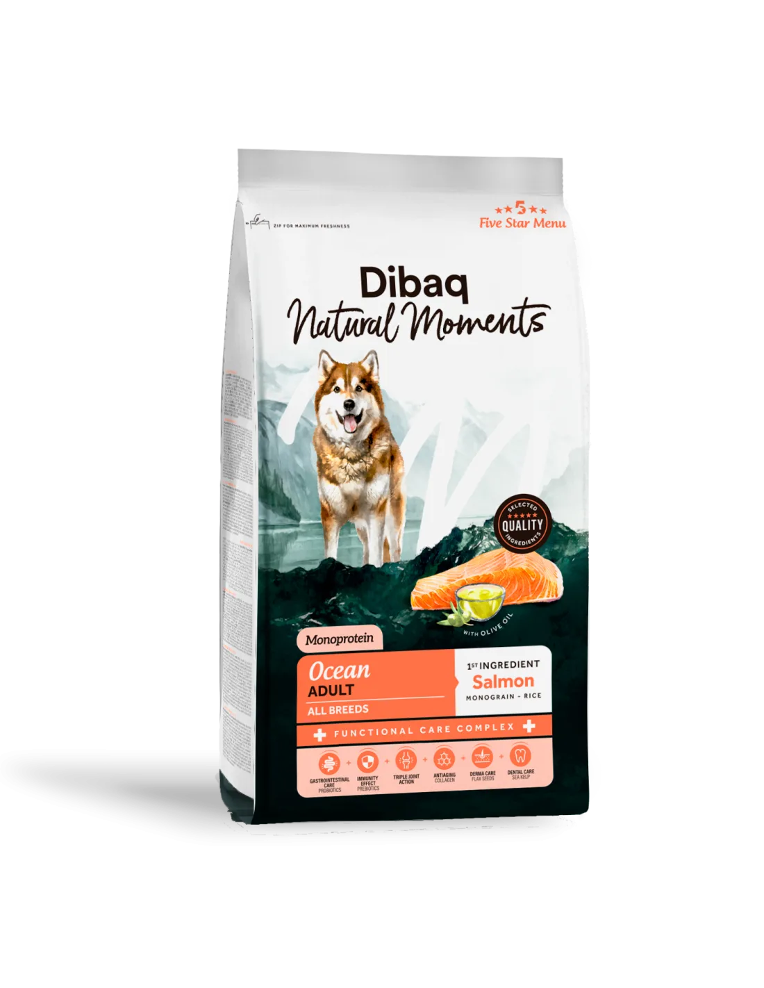 Este alimento premium incorpora o exclusivo Complexo de Cuidados Funcionais, com prebióticos FOS e MOS, probióticos, extrato de mandioca, algas marinhas, sementes de linho, azeite e plantas funcionais como erva-cidreira, hortelã e camomila. Além disso, inclui condroitina, glucosamina, MSM e colagénio para proteger as articulações e promover a mobilidade ideal. O seu perfil nutricional destina-se a fortalecer o sistema imunitário, melhorar a saúde digestiva, proteger a pele contra a irritação e cuidar da saúde oral. Sem trigo, glúten, milho, soja ou corantes artificiais, o Dibaq Ocean é uma opção completa, segura e deliciosa que combina o melhor do mar com a mais avançada nutrição natural.