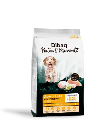 Dibaq Natural Moments Farm & Field Adult Medium é um alimento de alta qualidade formulado para cães adultos de médio porte, combinando o melhor da natureza com inovação nutricional. Feita com 39% de peru e frango como principais fontes de proteína animal, e arroz como único cereal (monogrão), esta receita proporciona uma dieta altamente digerível, saborosa e equilibrada, ideal para manter a condição física ideal. Disponível nos formatos de 2 kg e 12 kg, com croquetes de tamanho adaptado (13,5-16,5 mm) para uma mastigação adequada.