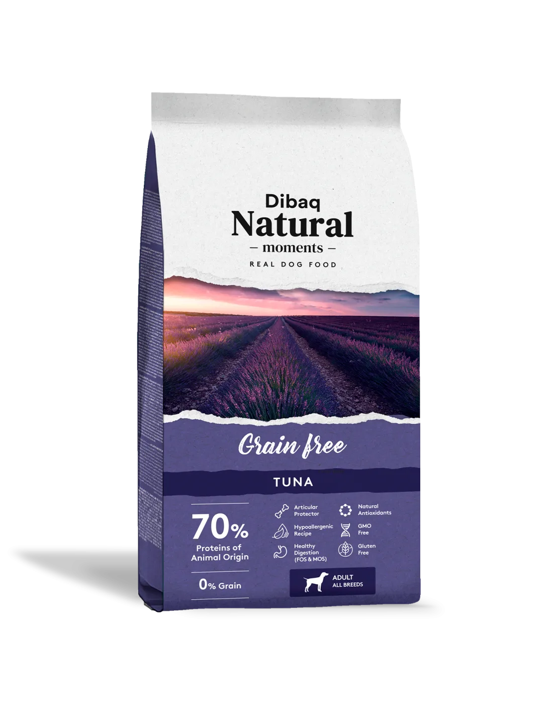 Alimento completo Hipoalergénico para cães adultos de todas as raças sem grãos com até 95% de proteína de origem animal. É feito com atum, batata, ervilha, protetores de articulações, plantas naturais, extrato de mandioca para neutralizar odores, prebióticos e antioxidantes naturais. Receita sem glúten.