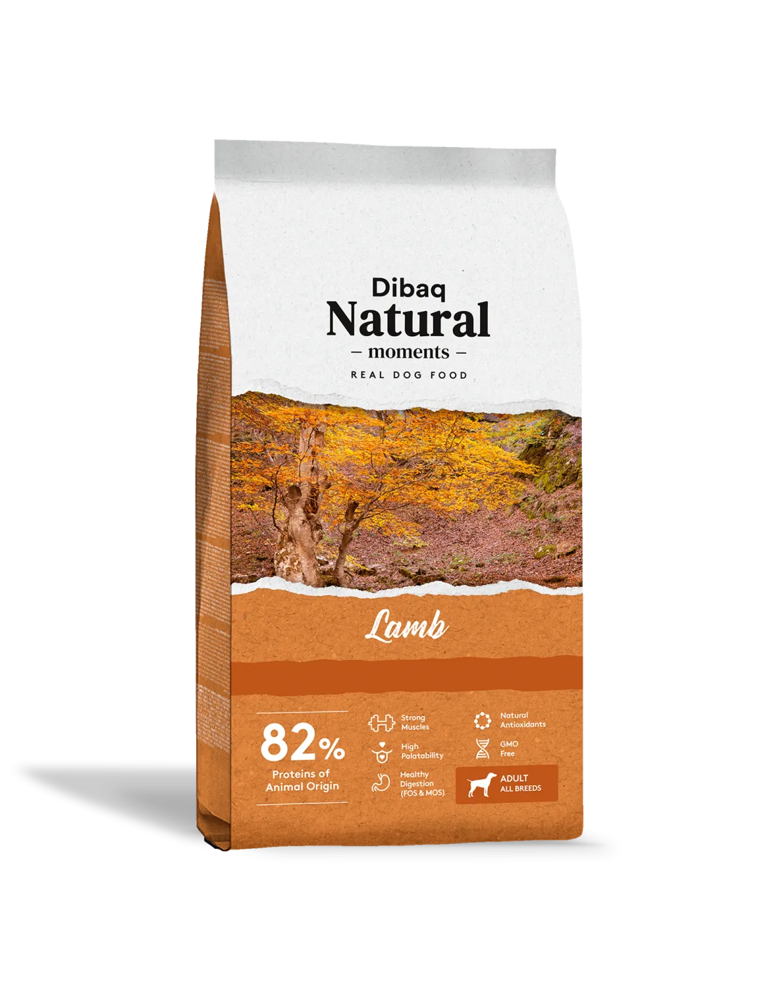 Dibaq Natural Moments Borrego é um alimento para cães adultos de todas as raças com até 95% de proteína de origem animal que ajuda a manter a musculatura forte. É feito com cordeiro, batata, plantas naturais, extrato de mandioca para neutralizar odores, prebióticos e antioxidantes naturais