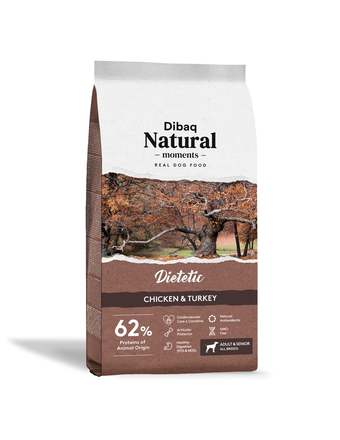 Alimento natural completo para cães adultos com excesso de peso ou cães sénior . É elaborado com Frango e Peru, protetores de articulações, plantas naturais, extrato de mandioca para neutralizar odores, prebióticos e antioxidantes naturais.