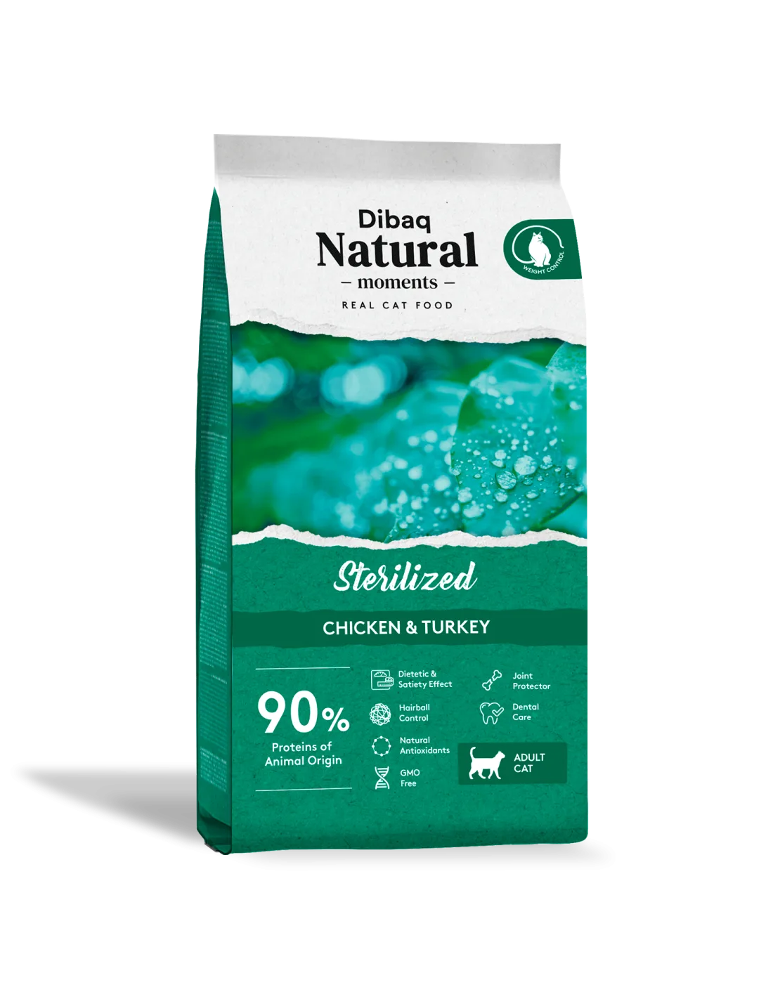 Dibaq Natural Moments Cat Esterilizado Frango e Perú, é um alimento Super Premium completa para gatos adultos esterilizados com tendência a excesso de peso, com uma cuidadosa seleção de ingredientes naturais.