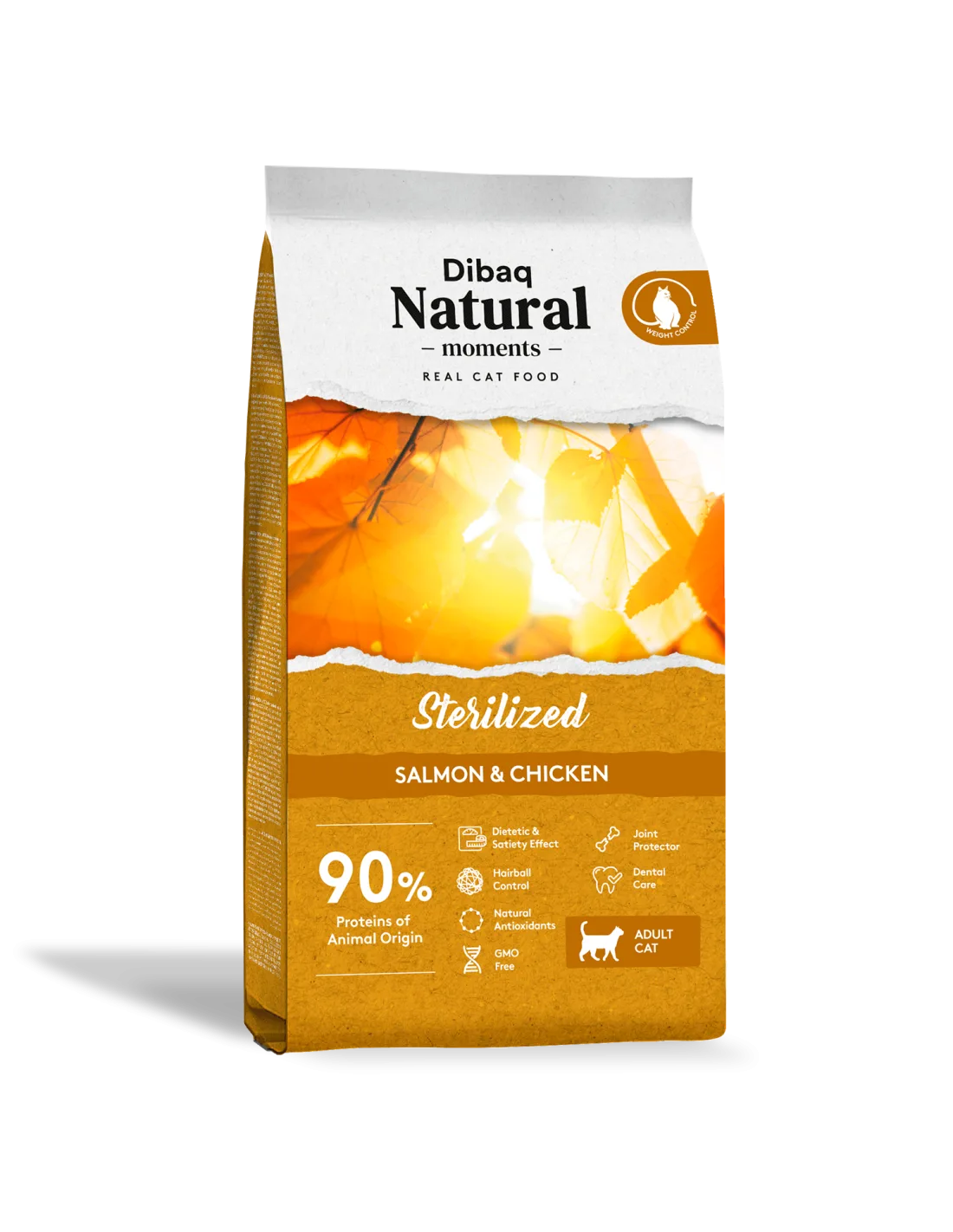 - Alimento completo para gatos adultos esterilizados à base de salmão e frango.