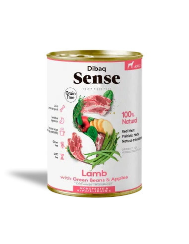 DIBAQ SENSE LAMB , é um alimento húmido super premium, feita com carne fresca de Cordeiro com feijão verde e maçã .