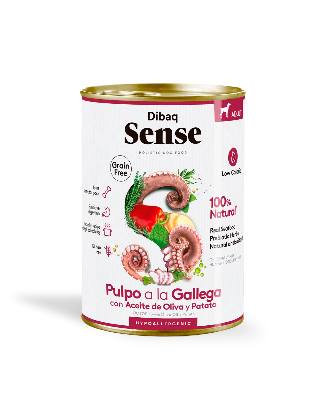 Polvo fresco 42%*, peixe branco fresco 40%*, batata 11%, azeite 1%*, pimento vermelho fresco 1%*, óleo de salmão 1% (fonte de ácidos gordos ómega 3 e 6), pacote de proteção articular 0,5% (sulfato de condroitina, cloridrato de glucosamina e MSM), minerais, ervas com propriedades antioxidantes naturais 0,02% (alecrim 0,01%*, tomilho 0,005%* e orégãos 0,005%*). *Ingredientes naturais.