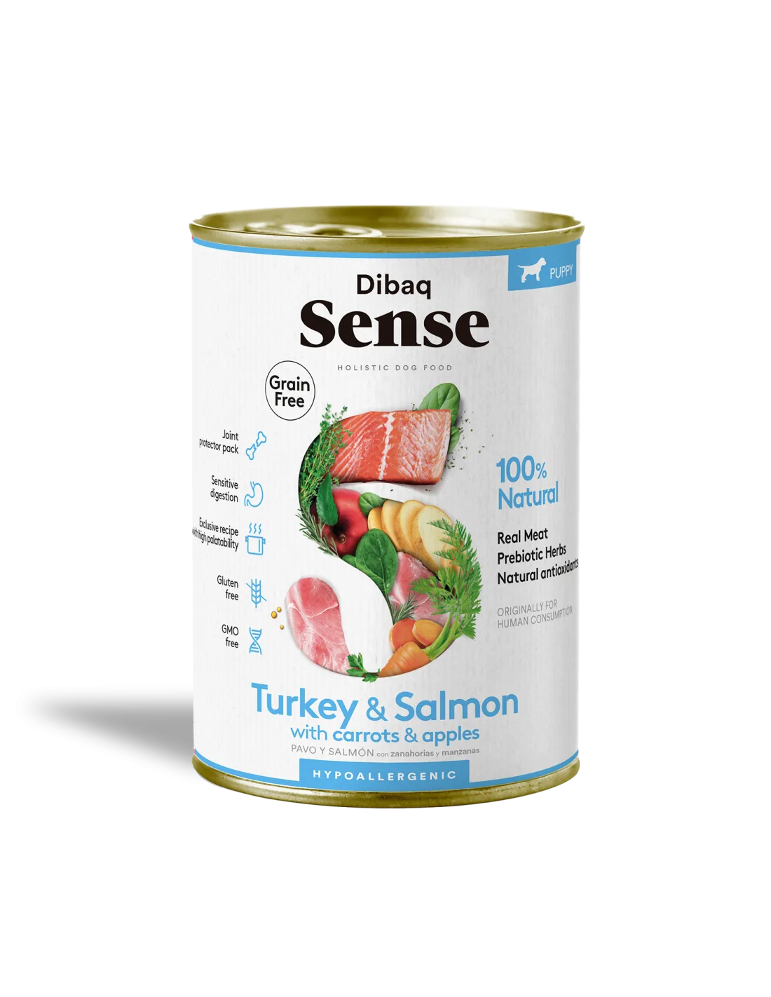 DIBAQ SENSE SALMÃO & PERÚ PUPPY , é um alimento húmido super premium, feita com carne fresca Salmão e Perú com cenoura e maçã .