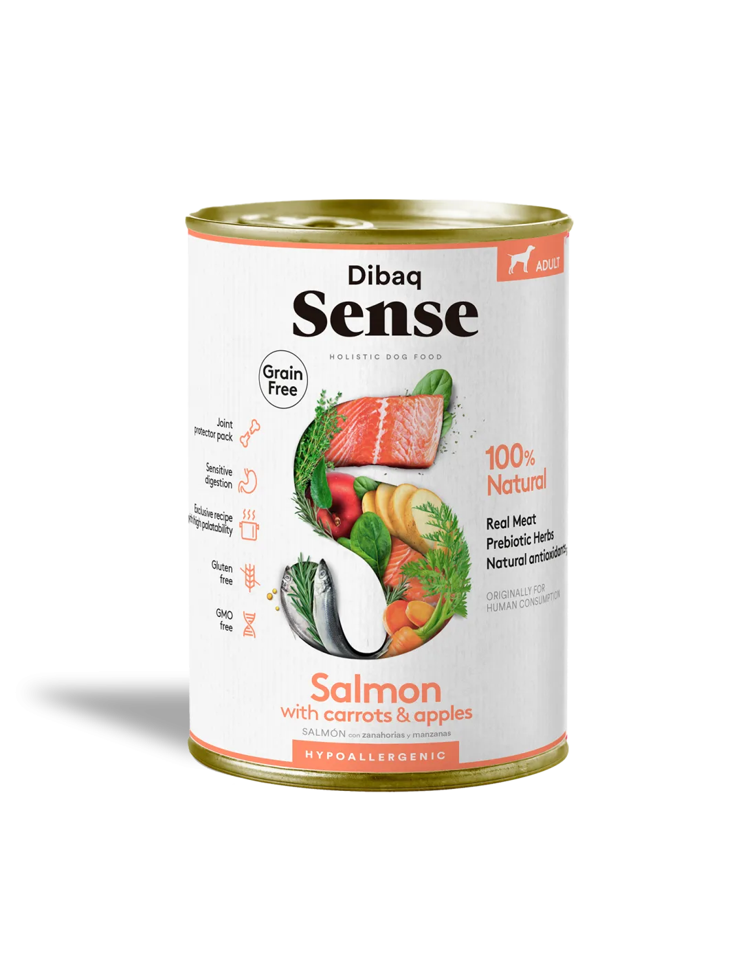 DIBAQ SENSE SALMÃO , é um alimento húmido super premium, feita com carne fresca de Salmão com cenoura e maçã .