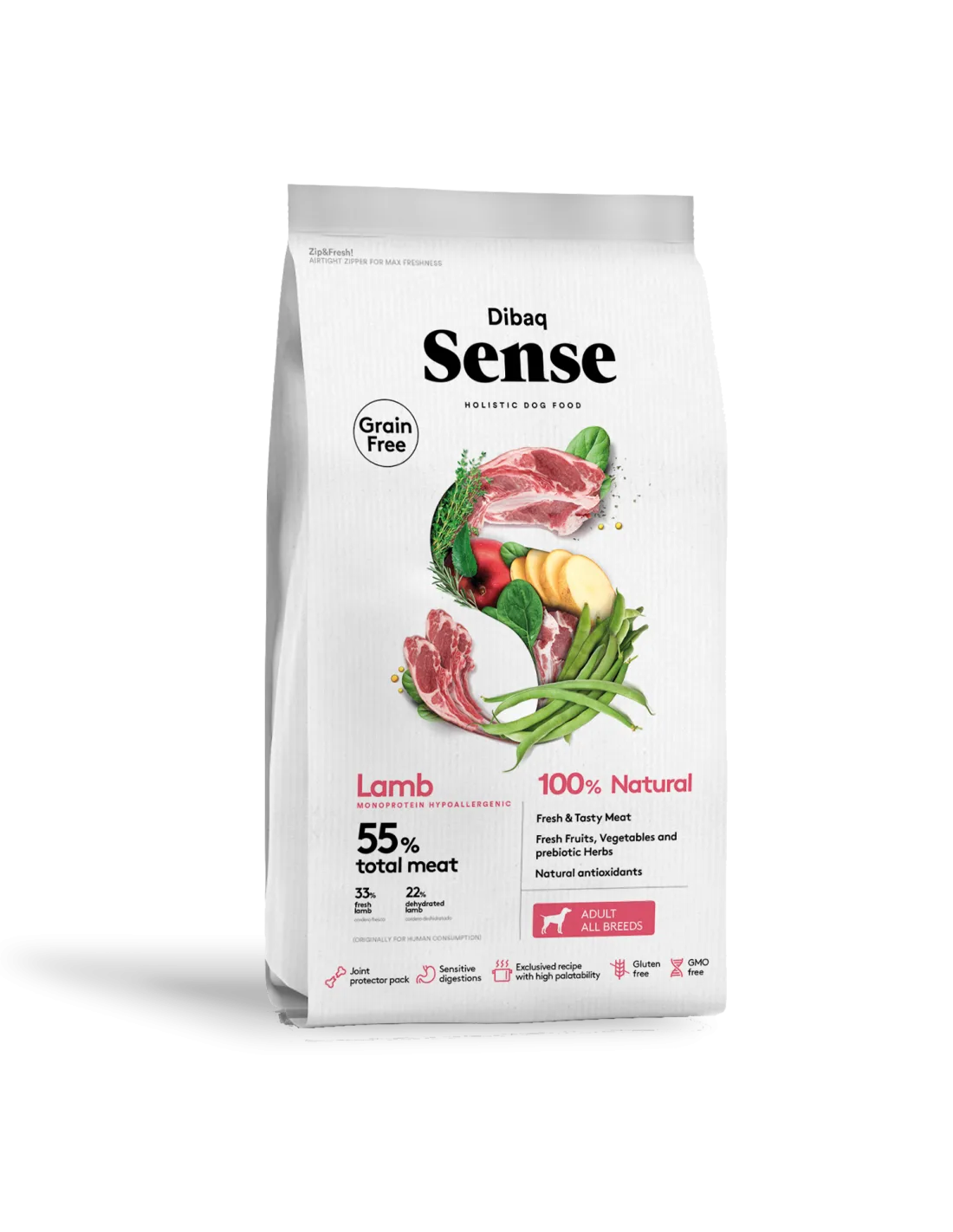 Dibaq Sense , alimento para cães adultos de todas as raças Hipoalergénico, monoproteico e 100% natural. Sem grãos, com carne fresca de cordeiro e uma seleção de frutas e vegetais frescos, garante alto valor nutritivo. Descubra a qualidade do Dibaq Sense , a melhor ração para cães