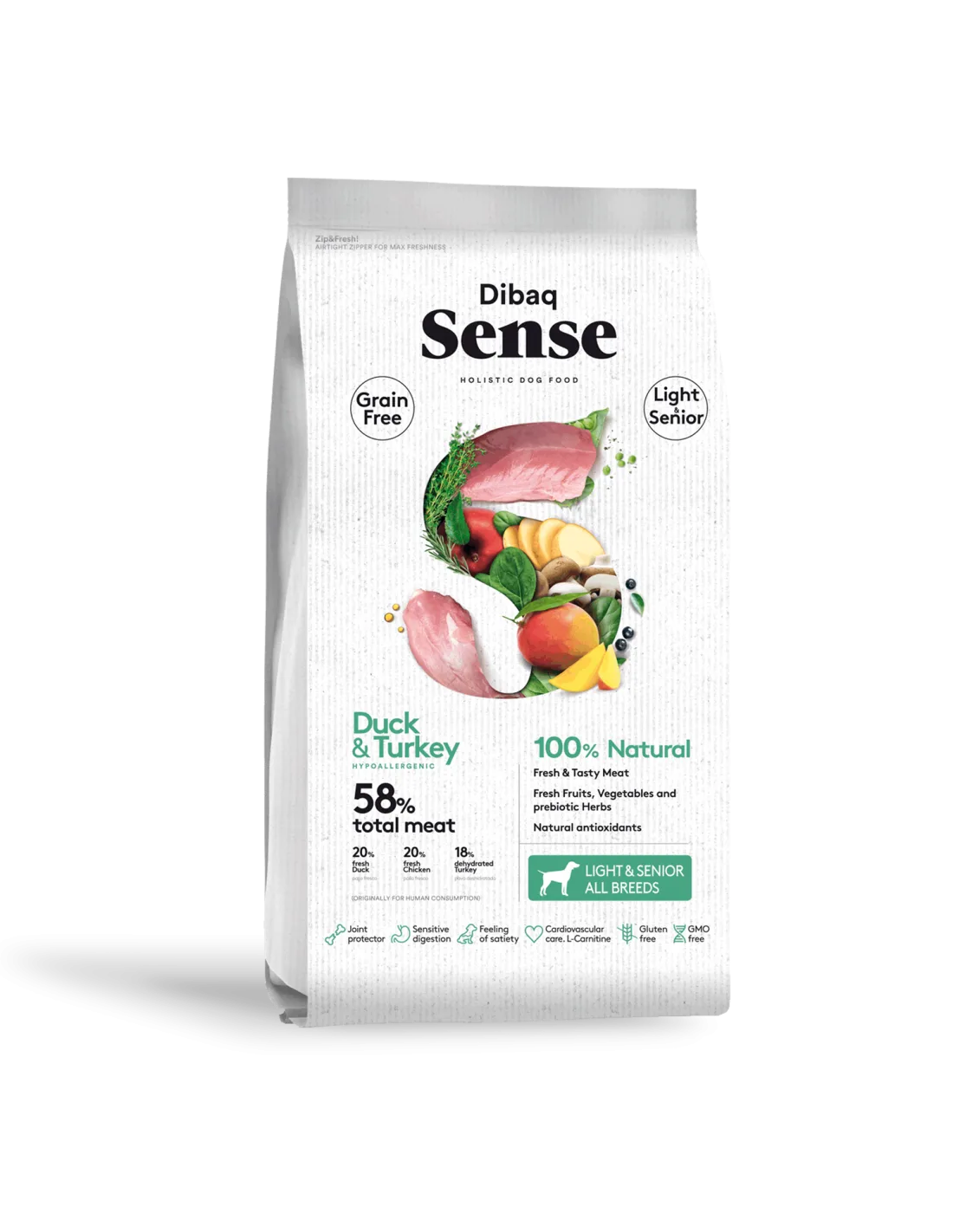 Alimento hipoalergénico e 100% natural para cães idosos ou com mais de 7 anos e para adultos com tendência à obesidade. Feito sem grãos e com protetor articular.