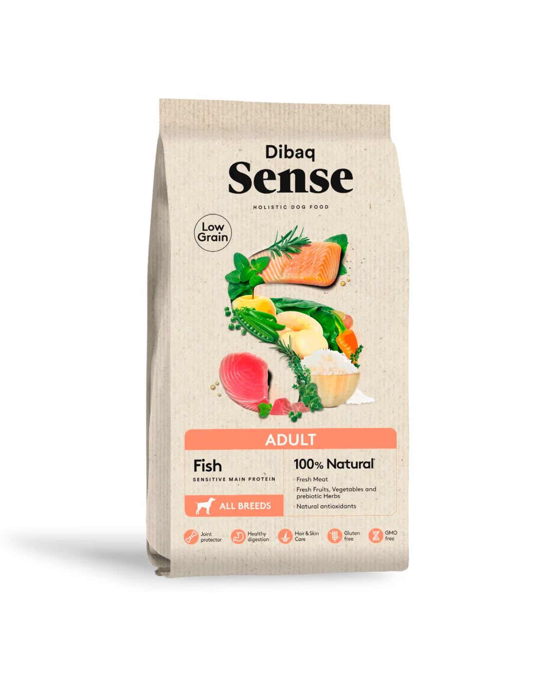 Dibaq Sense Adultos Peixe: alimento completo para cães adultos de todas as raças, com salmão fresco e arroz. Ingredientes altamente digeríveis e palatáveis que garantem ingestão adequada de proteínas e energia .