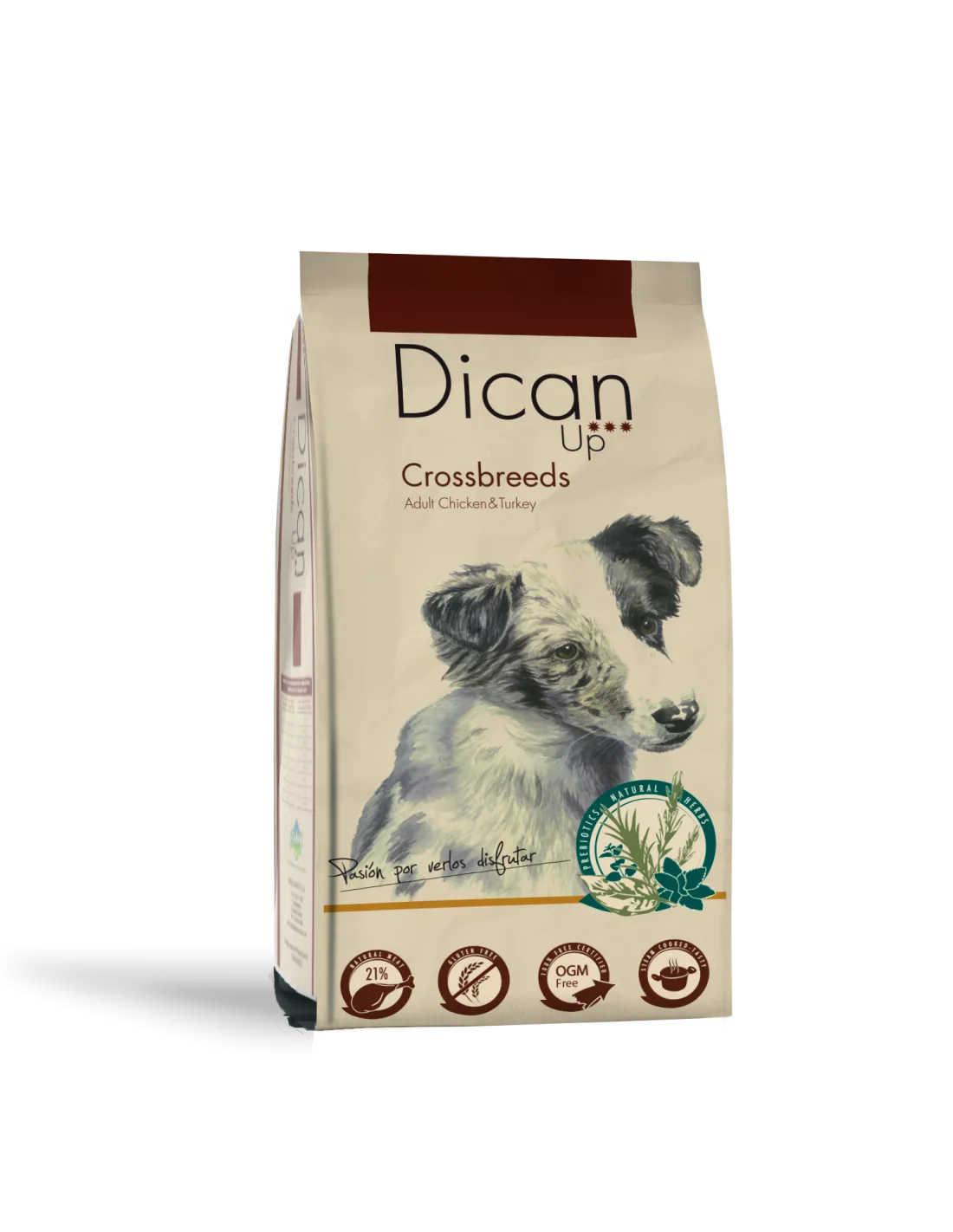 Milho inteiro, carne desidratada (frango 9%, peru 12%), fibra de cereais 10% (fonte natural de fibra), óleo de frango refinado, alfarroba, fígado de frango ultrahidrolisado, substâncias minerais, azeitonas e extratos naturais de plantas (fontes de prebióticos naturais ( Mandioca 0,02% (Yuca filamentosa), Camomila 0,01% (Chamaemelum nobile), Erva-cidreira 0,01% (Melisa Oficinales), Alecrim (Rosmarinus oficialis)).
