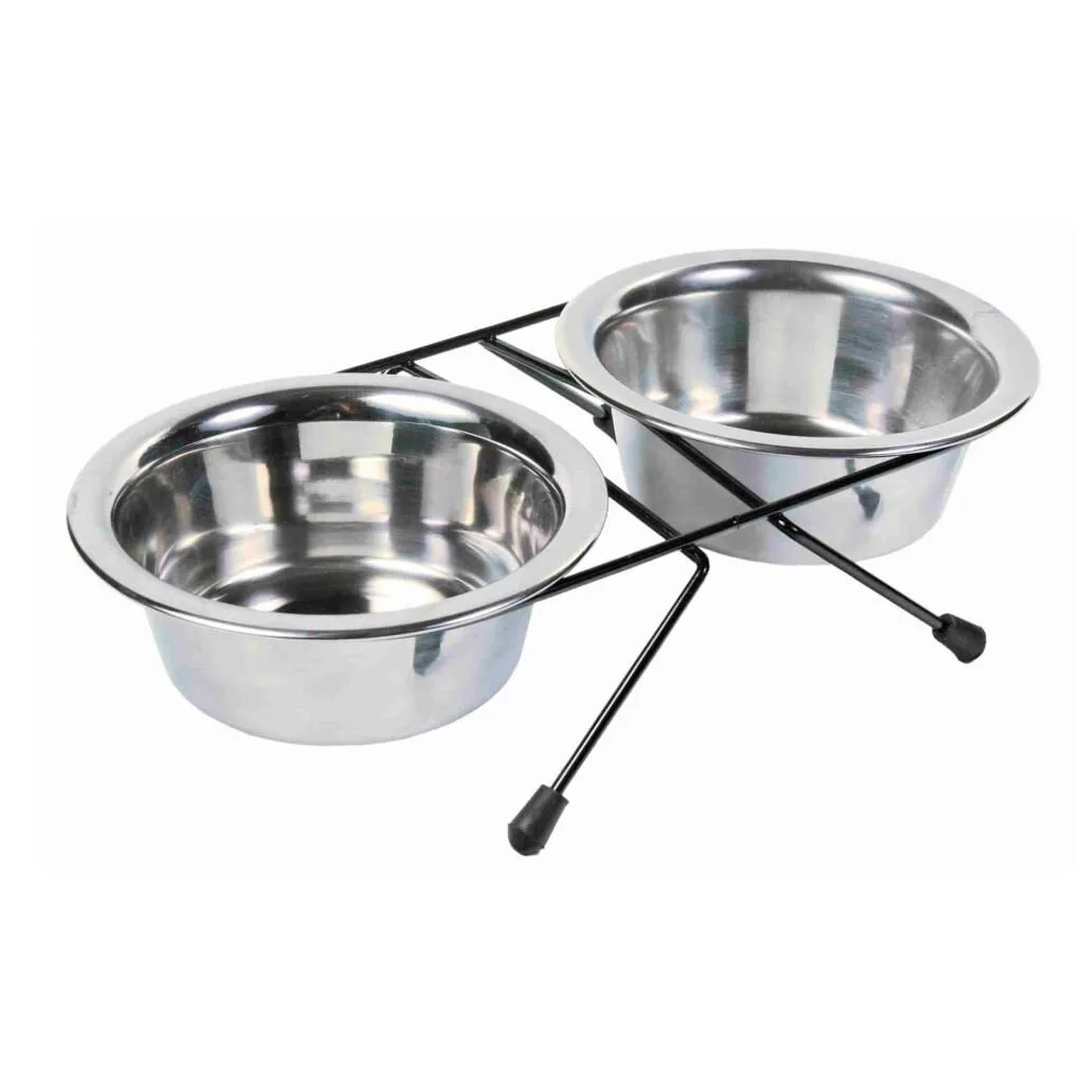 - Inox resistente - 2 gamelas em inox com suporte em metal - Suporte em metal, lacado a preto - Antiderrapante, graças aos pés em borracha
