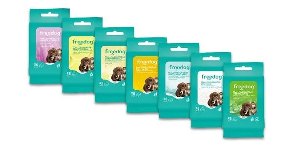 Talco – As toalhitas húmidas Freedog são perfeitas para ter sempre à mão na higiene do seu animal de estimação, eliminando os maus odores e limpando a fundo o pelo e as patas após o passeio diário. As toalhitas Freedog são também recomendáveis na higiene e limpeza da cara, orelhas e zona anal. Possuem uma fórmula húmida e delicada com aloé vera e talco. Instruções: Levante a etiqueta superior da toalhita e pegue numa. Limpe, suavemente, o seu animal de estimação com uma toalhita na quantidade necessária. Mantenha o pacote fechado. Ingredientes: Água, EDTA-2NA, polisorbato 20, aloé vera, glicerina, vitaminas E solúveis em água, propilenoglicol, sorbato de potássio, hidróxido de sódio, TG, talco. Material: Spunlace 45gr. PRECAUÇÃO: NÃO USAR EM CRIANÇAS. Concebido apenas para uso em animais.