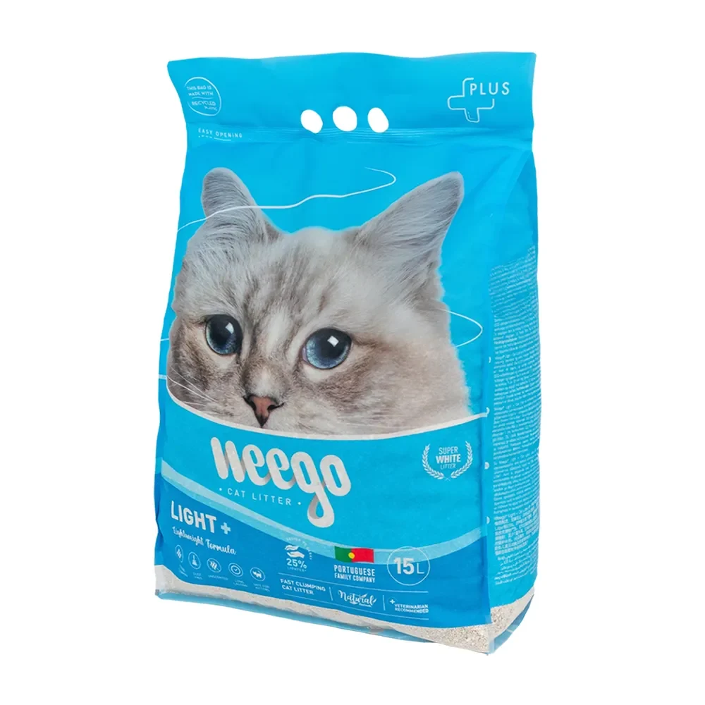 Weego Light+ é uma areia aglomerante de alta qualidade feita a partir de bentonite natural e com outros minerais adicionados, não tóxica. Não cria pó (ideal para gatos alérgicos) e 25% mais leve que Weego® Baby Powder Cat Litter. Esta fórmula é mais fácil de transportar e particularmente absorvente, o que permite uma redução de emissões de CO2. É ideal para gatos alérgicos e sensíveis ao cheiro e não se cola às patas.